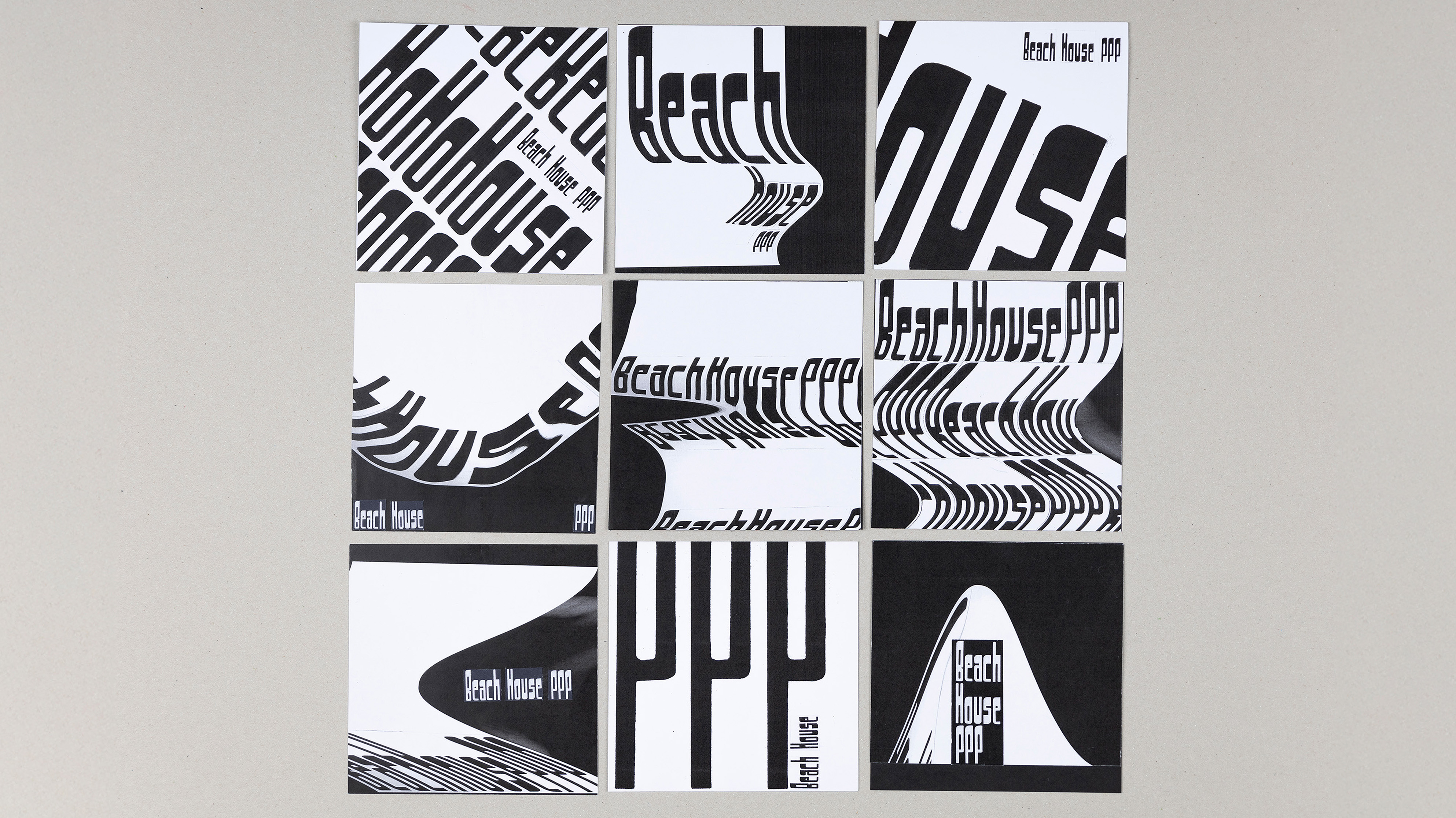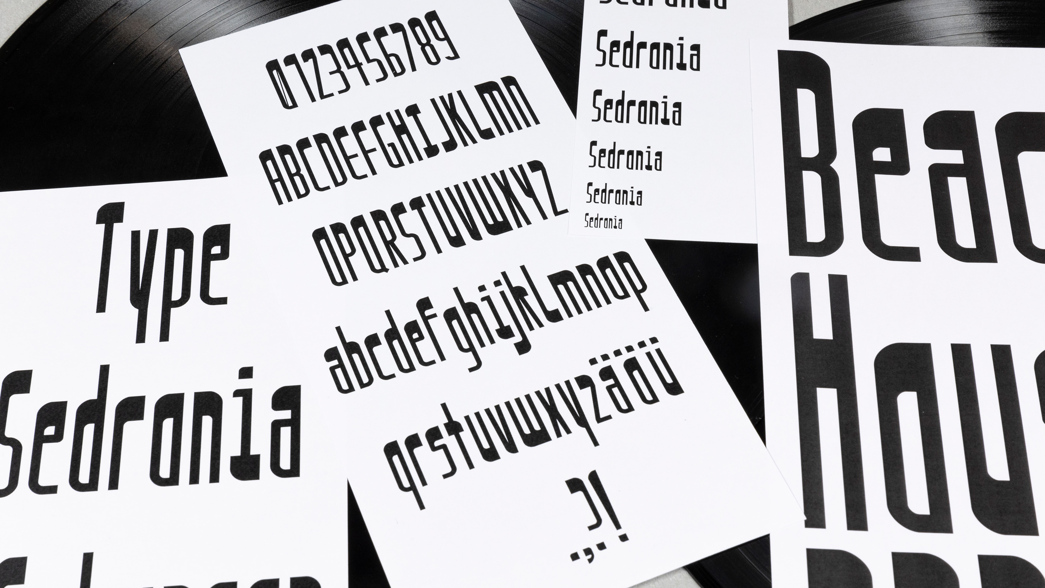Schriftdesign Ich erstellte eine Schrift namens «Sedronia» aus einem im Illustrator auseinandergenommenen und abstrahierten CD-Laufwerk und dessen daraus entstandenen Formen. Ebenso inspirierte mich der Song «PPP» von «Beach House». Die Schrift hat abgerundete Kanten, was ich mit Wellen und dem Meer assoziierte. Ausserdem passt dies zum Bandnamen von «Beach House». Die Schrift soll deshalb auch an ein Ferien-Reihen-Haus am Strand erinnern und läuft durch den «condensed» Schriftschnitt eng zusammen. Einige Entwürfe von Plattencovern designte ich analog. «Sedronia» ist für Titel und bei allgemein grosser Anwendung empfohlen.